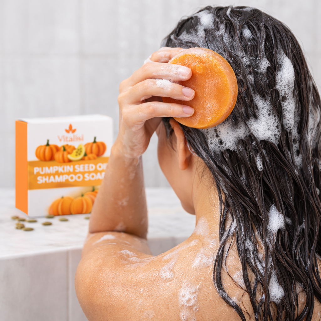 This gentle, plant-based shampoo bar is designed to cleanse the scalp while supporting healthier-looking hair and visible fullness through simple, everyday use.
