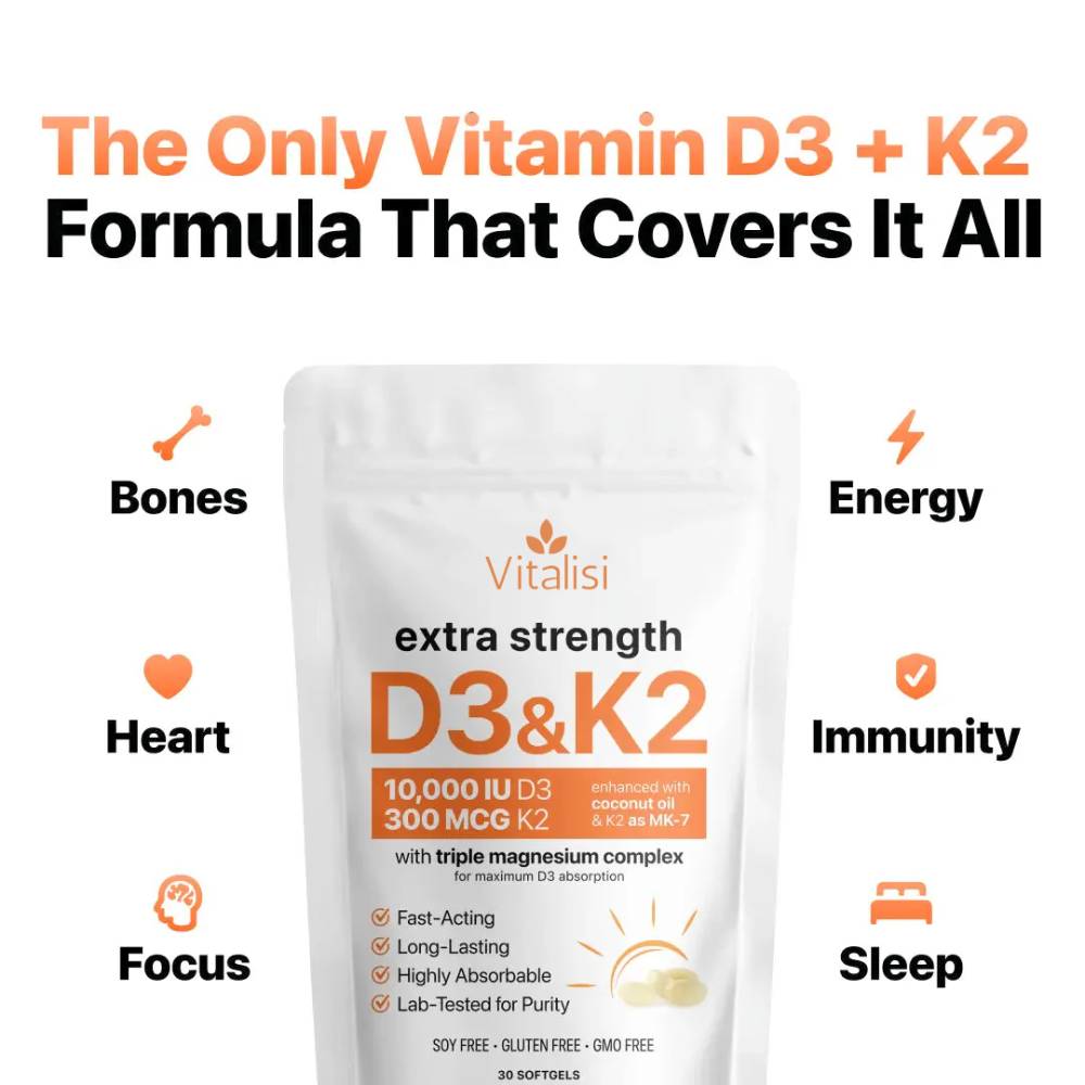 Many vitamin D supplements overlook proper calcium balance or use low quality forms that limit effectiveness. Vitalisi Vitamin D3 K2 is designed to support bone strength, immune health, and cardiovascular balance by combining Vitamin D3 with K2 in a clean, well balanced formula your body can use daily.